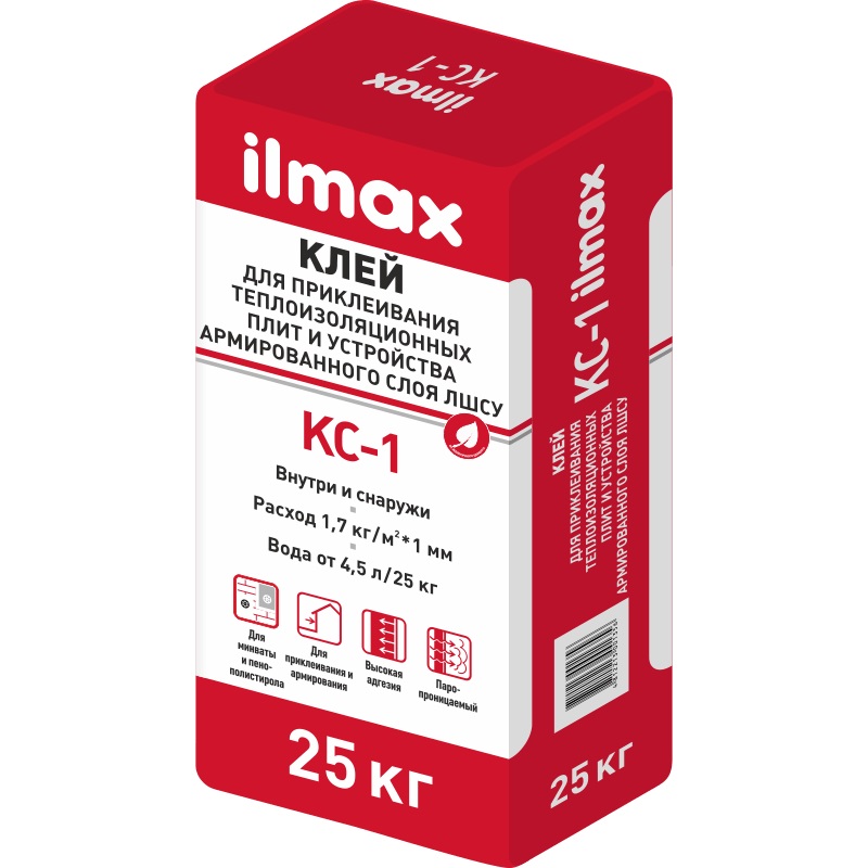 ilmax КС-1 ЗИМА предназначен для создания армированного слоя, а также для приклеивания теплоизоляционных плит из минеральной ваты или пенополистирола в лёгких штукатурных системах утепления. Используется при утеплении новых и эксплуатируемых зданий на основаниях из кирпича, блоков, бетона, цементных и цементно-известковых штукатурок и других минеральных основаниях. Имеет высокий коэффициент паропроницаемости. Рекомендуется для производства работ при низкой температуре.