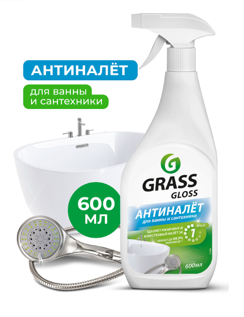 Бытовая химия Grass (ГраСС).Чистящее средство для ванной комнаты Gloss (Глосс). Средства для уборки линейки Gloss подходят для ванных комнат,чистки ванны, душевых кабин, сантехники, фаянсовых изделий и кафеля от известкового налета, потеков ржавчины, мыльных разводов и солевых отложений. Чистящее средство grass Gloss эффективно удаляет сложные и застарелые загрязнения. Безопасное средство для акриловых ванн, работает как отбеливатель. Придает поверхности чистоту и блеск, сохраняя эффект на несколько дней. На поверхностях, чувствительных к кислоте, держать не более 30 секунд.