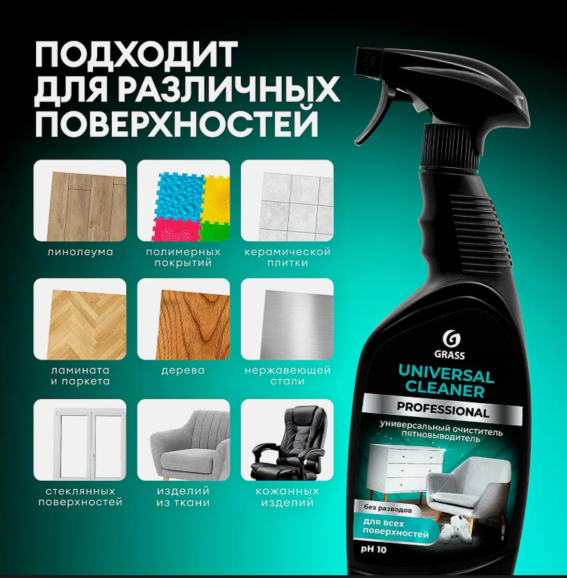 Универсальное чистящее средство широкого спектра действия. Эффективно удаляет различные загрязнения с водостойких поверхностей: линолеума, полимерных покрытий, керамической плитки, ламината, паркета, дерева, нержавеющей стали, стеклянных поверхностей, а также изделий из ткани и кожи, не повреждая волокон тканей. Эффективное средство для регулярной уборки, подходит и для сильно загрязненных поверхностей. Не оставляет разводов. Устраняет неприятные запахи.