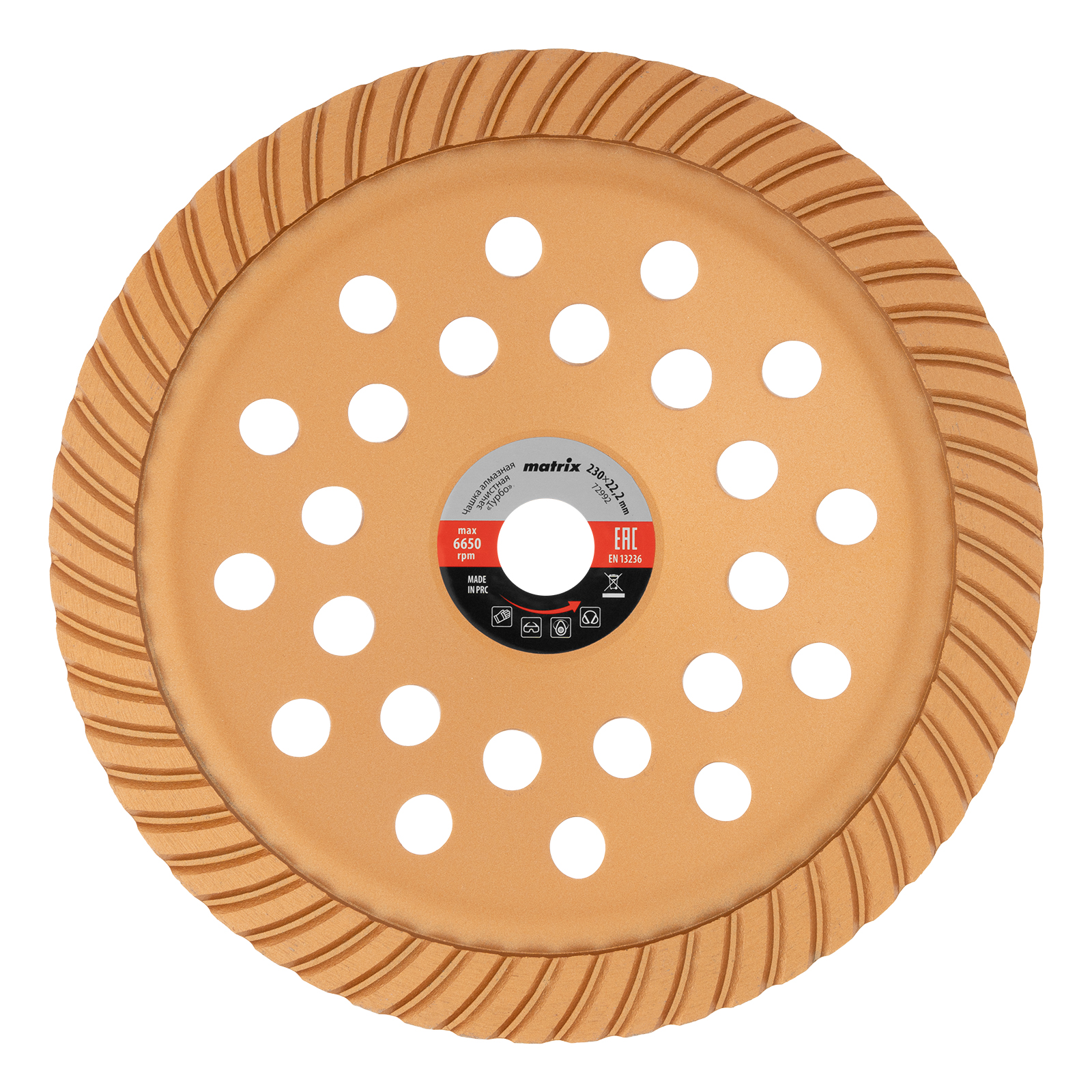 Алмазная зачистная чашка Matrix Turbo 72992 диаметром 230 мм устанавливается на вал углошлифовальной машины, для чего предусмотрено посадочное отверстие 22,2 мм. Используется для придания окончательной гладкости бетонным, каменным, мраморным, гранитным и кирпичным поверхностям, а также для снятия фаски на плитах из гранита или мрамора. Предназначена для профессионального применения.