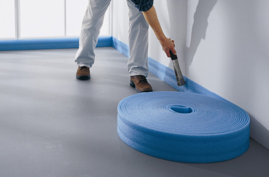 Демпферная лента представляет собой ленту из вспененного полиэтилена. Еще её называют кромочной или краевой лентой. Она укладывается между стяжкой и стеной по всему периметру помещения. Так же она может разделять большие массивы стяжки, выполняя роль компенсационного шва.
