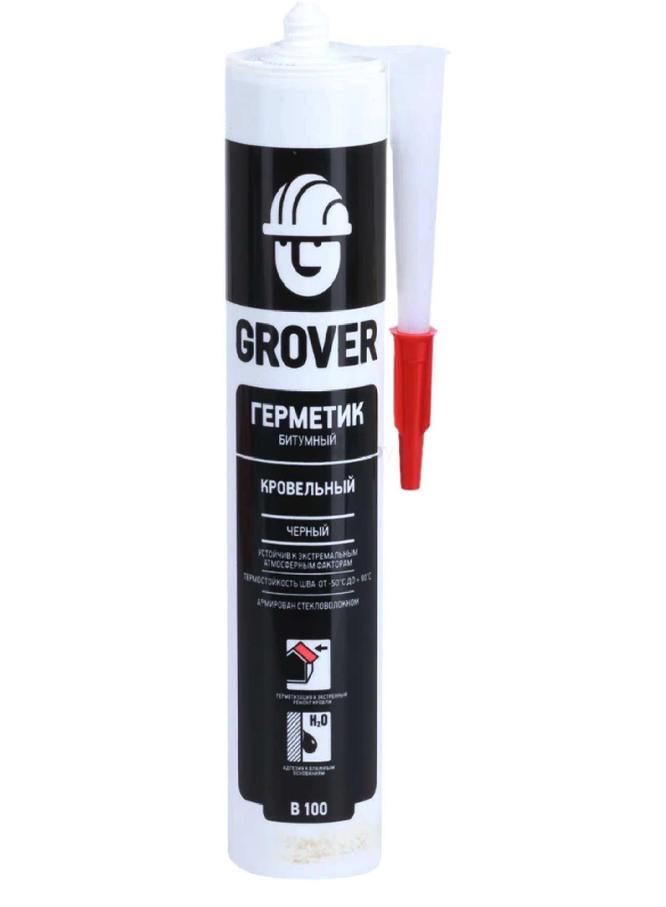 Герметик битумный GROVER B100 Кровельный черный 300 мл предназначен для герметизации и ремонта кровель из металлочерепицы, шифера, гибкой черепицы, керамической черепицы, цементно-песчаной черепицы, битумных волнистых листов, рубероида и других рулонных кровельных материалов.