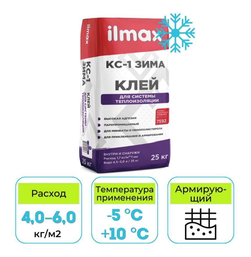 ilmax КС-1 ЗИМА предназначен для создания армированного слоя, а также для приклеивания теплоизоляционных плит из минеральной ваты или пенополистирола в лёгких штукатурных системах утепления. Используется при утеплении новых и эксплуатируемых зданий на основаниях из кирпича, блоков, бетона, цементных и цементно-известковых штукатурок и других минеральных основаниях. Имеет высокий коэффициент паропроницаемости. Рекомендуется для производства работ при низкой температуре.