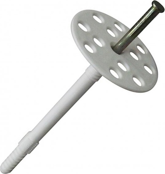 Конструкция крепежа для работ с фасадным утеплителем выделяется наличием широкой головки (на фото) – «зонтика», «гриба» или «тарелки», как ее еще называют. Она призвана обеспечить плотный прижим утеплителя (стандартный диаметр диска – 60 мм). Тарельчатый дюбель для надежного крепления теплоизоляции изготавливается из прочнейшего морозостойкого полипропилена. Фасадный утеплитель сначала приклеивается к поверхности клеем, затем крепится зонтами (они же - фасадные дюбель-гвозди). Длина зонта должна превышать толщину утеплителя на 70 мм.